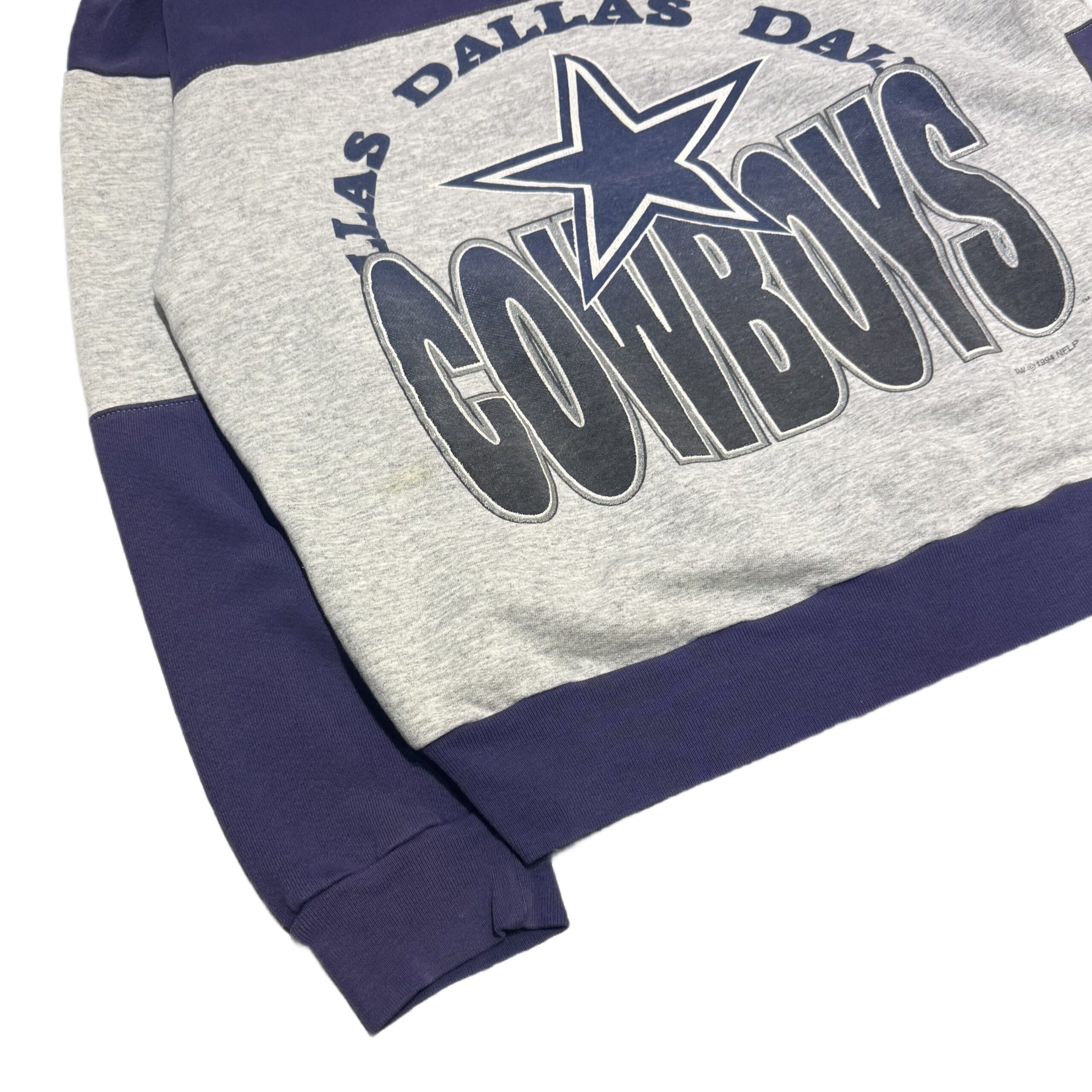 NFL所属のプロチーム「ダラス・カウボーイズ」のスウェット。パープル × グレーのチームカラーで構築された良い配色の一着です。サイズタグは欠損しておりますが、Lサイズ相当の大きさになります。