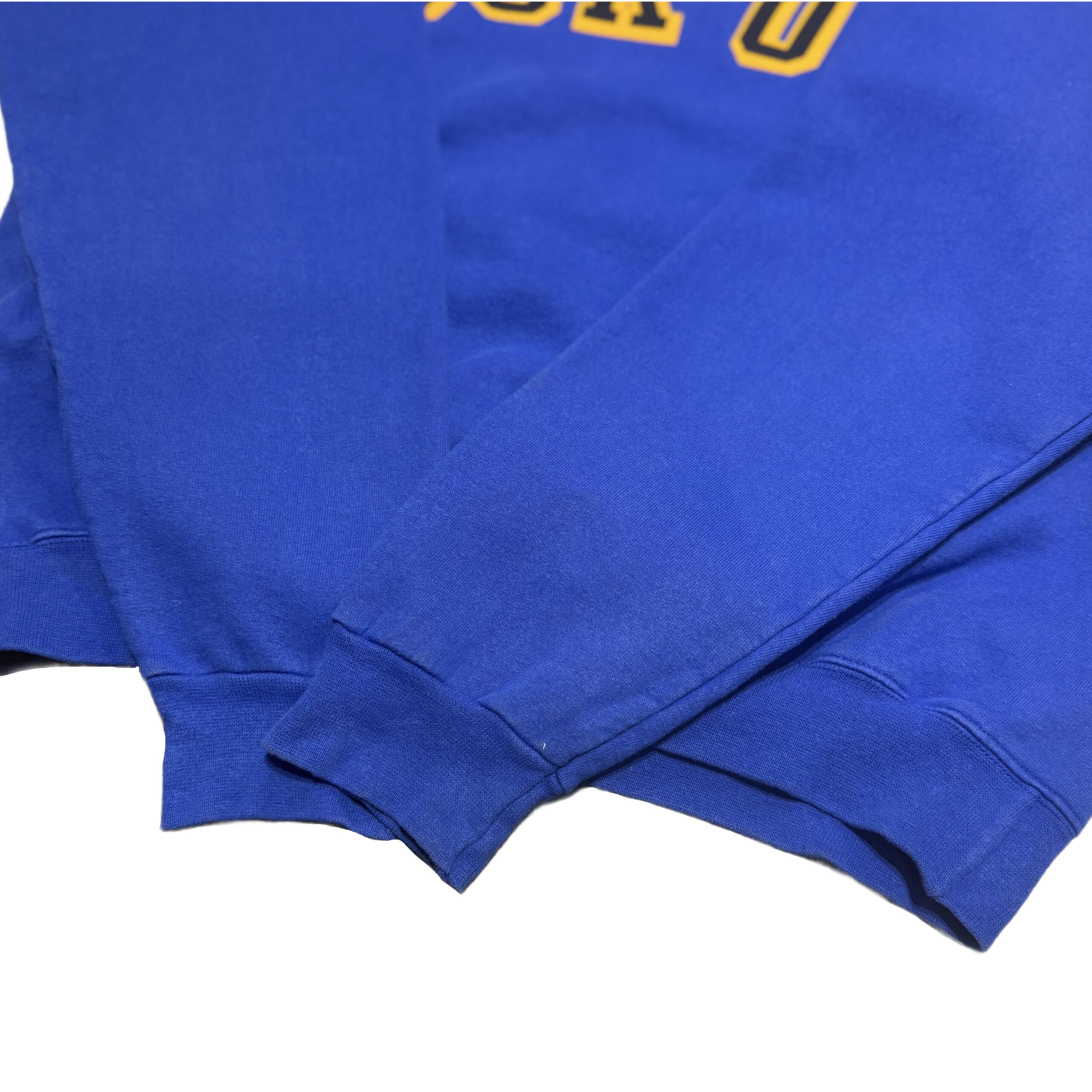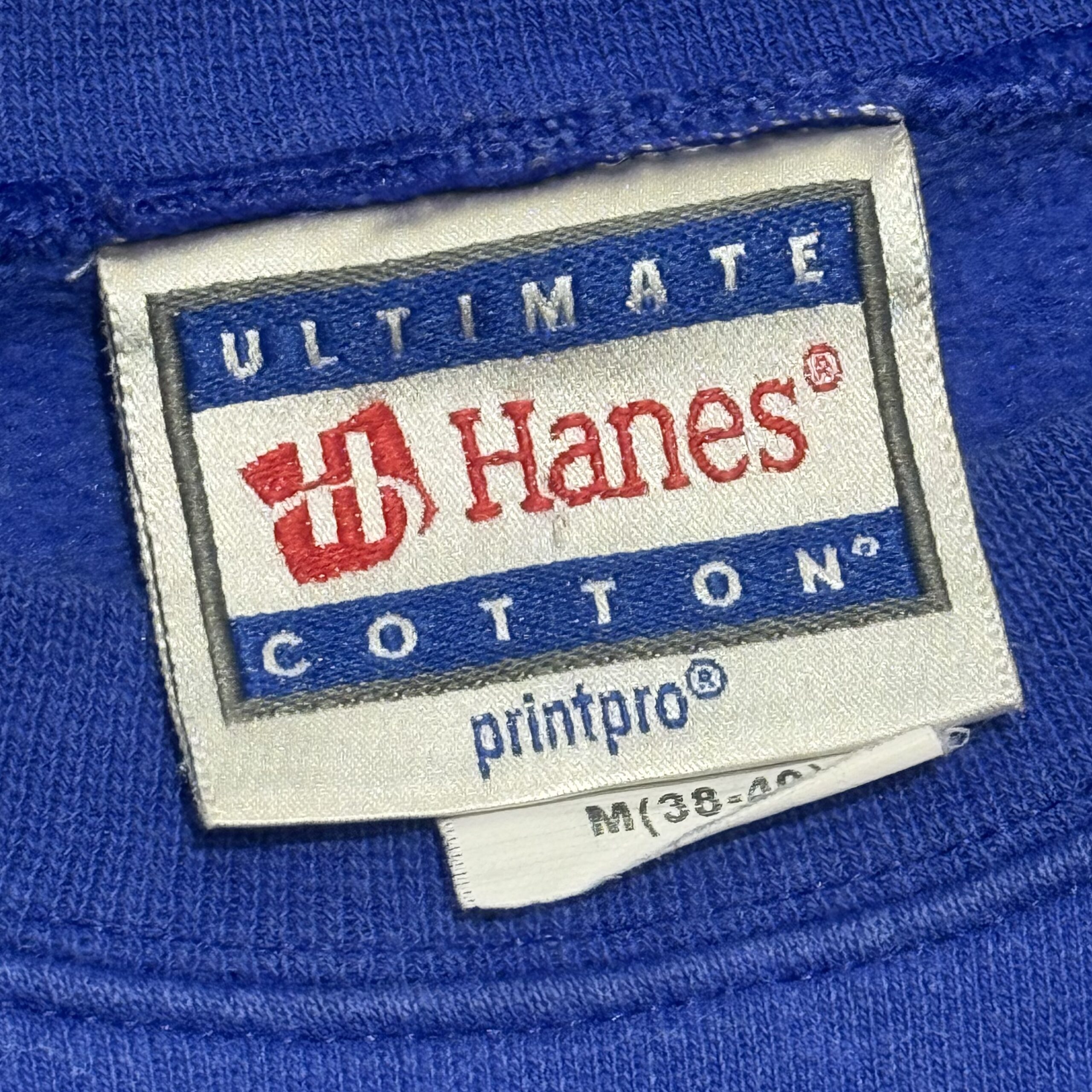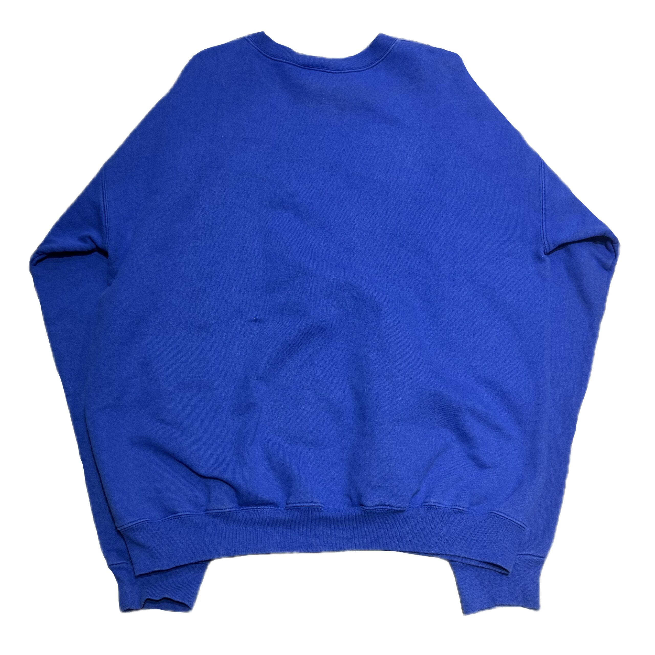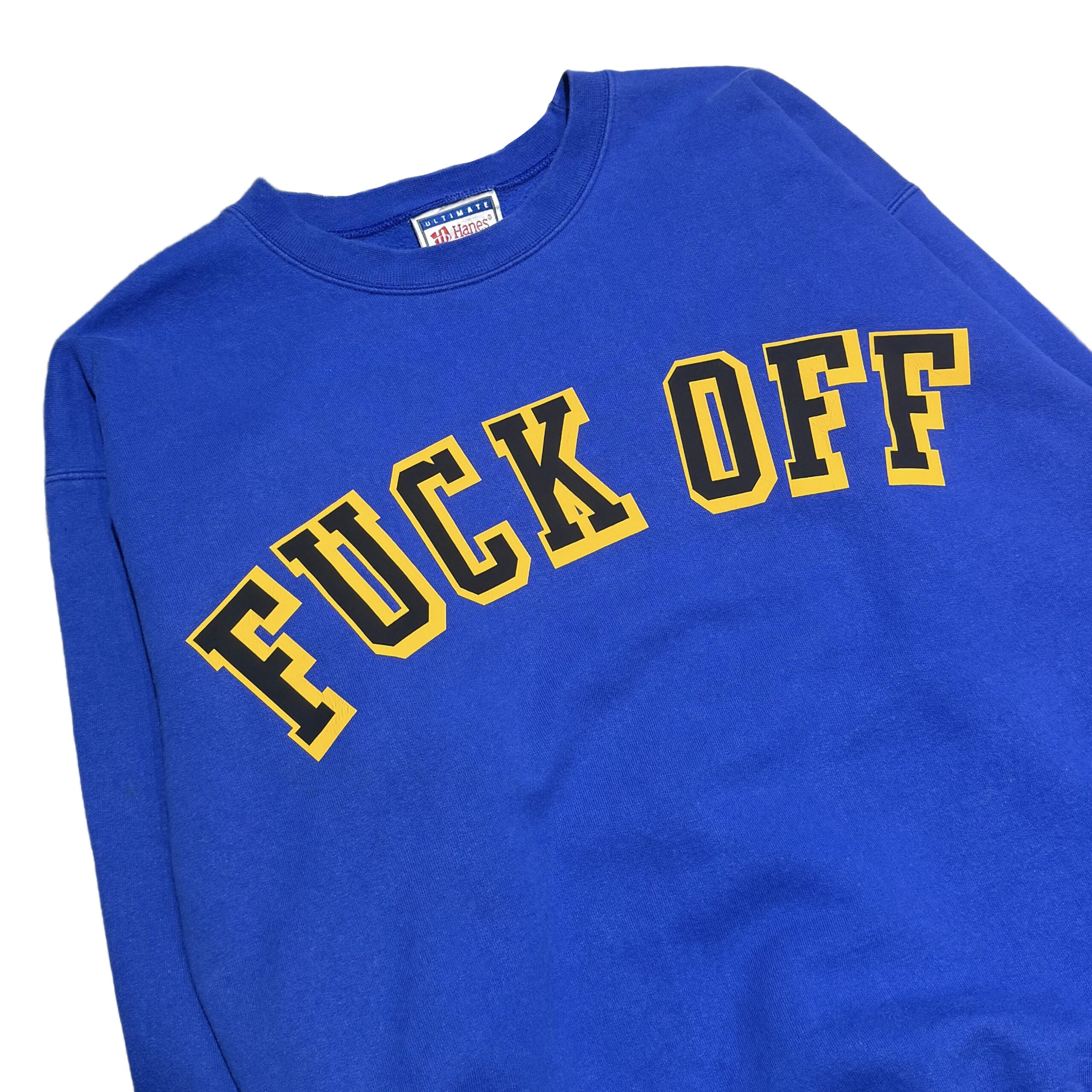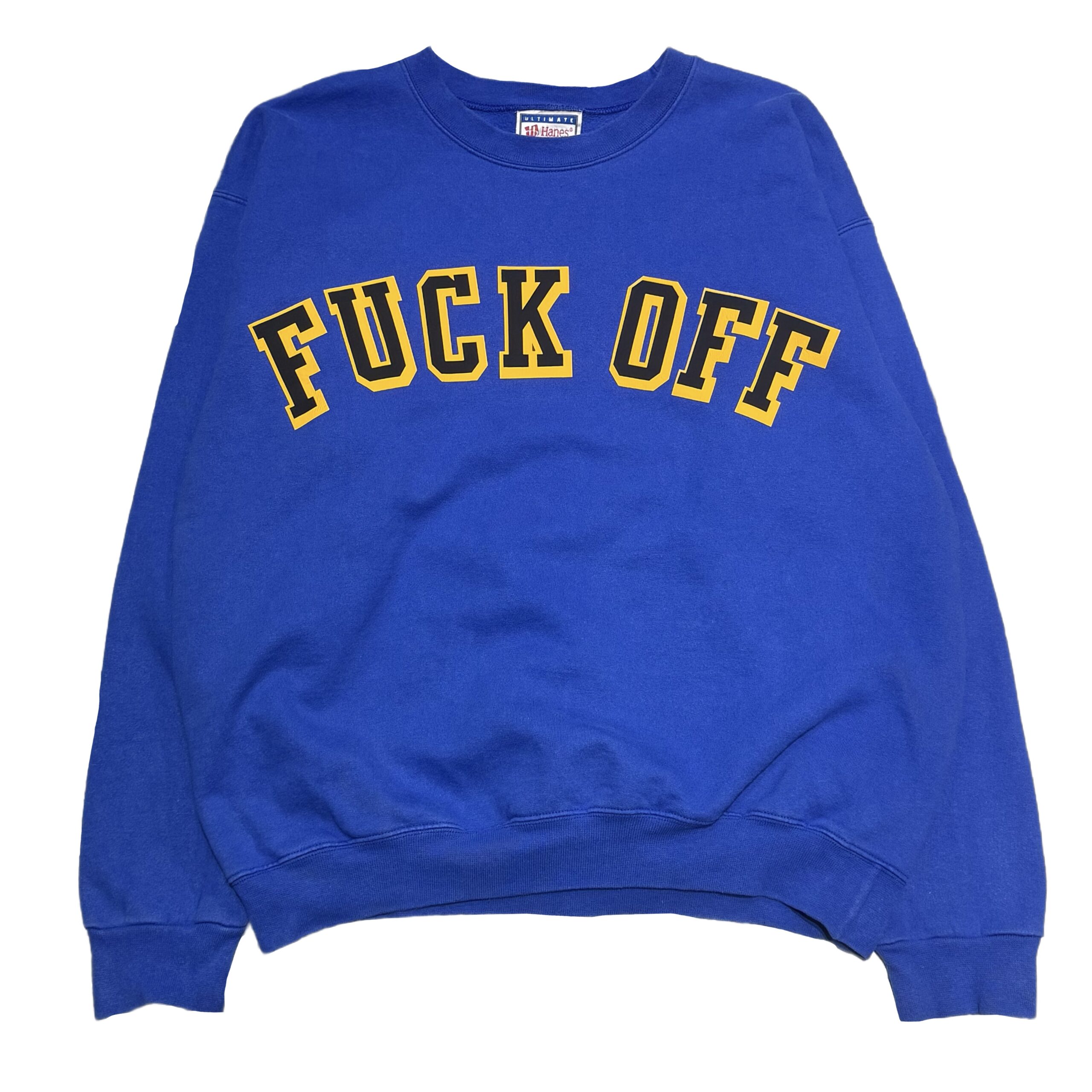 発色の良いブルーに「Fuck Off」とインパクトのあるデザインがプリントされた一着。かなり珍しいです。Mサイズ表記ですが、Lサイズ相当の大きさになります。身幅はしっかり広めですが、着丈は長すぎない絶妙なシルエットとなっております。