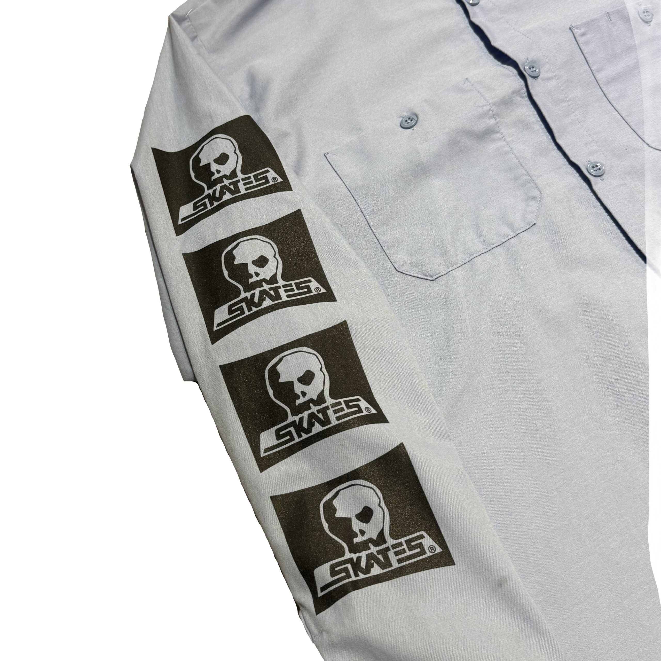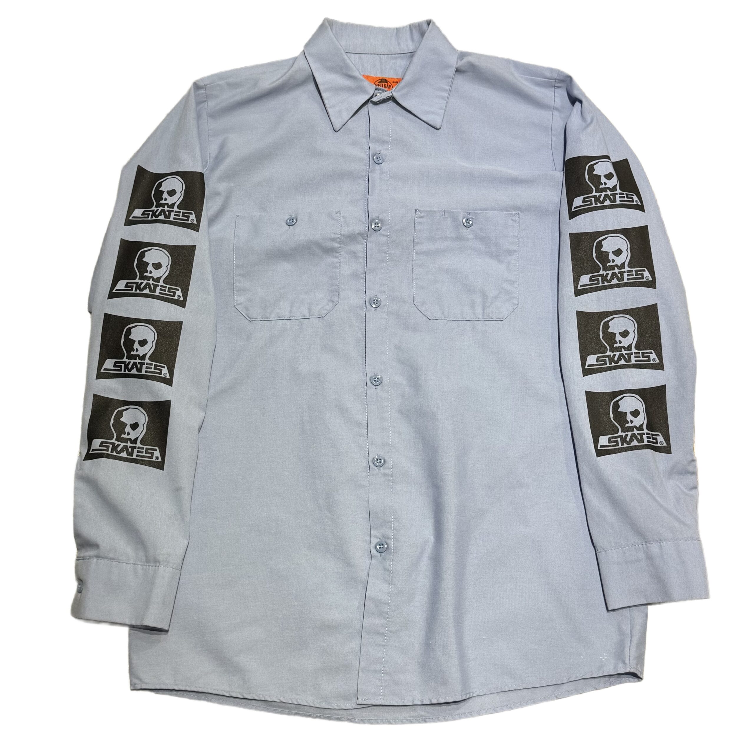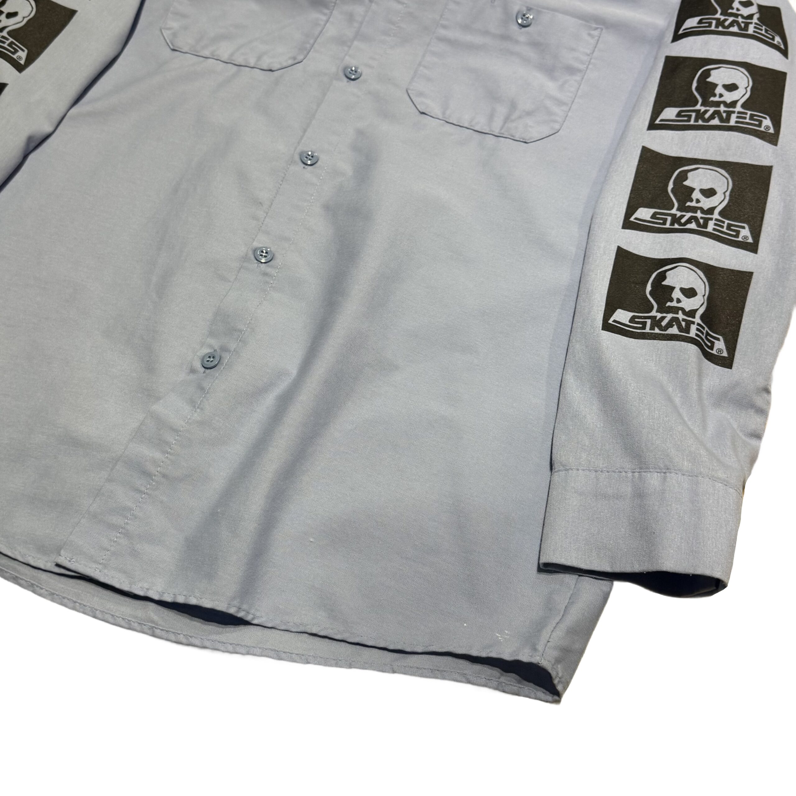 ライトブルーのボディにSKULL SKATESお馴染みのロゴが袖にプリントされた一着。様々なスタイルにも落とし込みやすく、ベストや大きめのTシャツなどと合わせてもカッコ良いかなと思います。