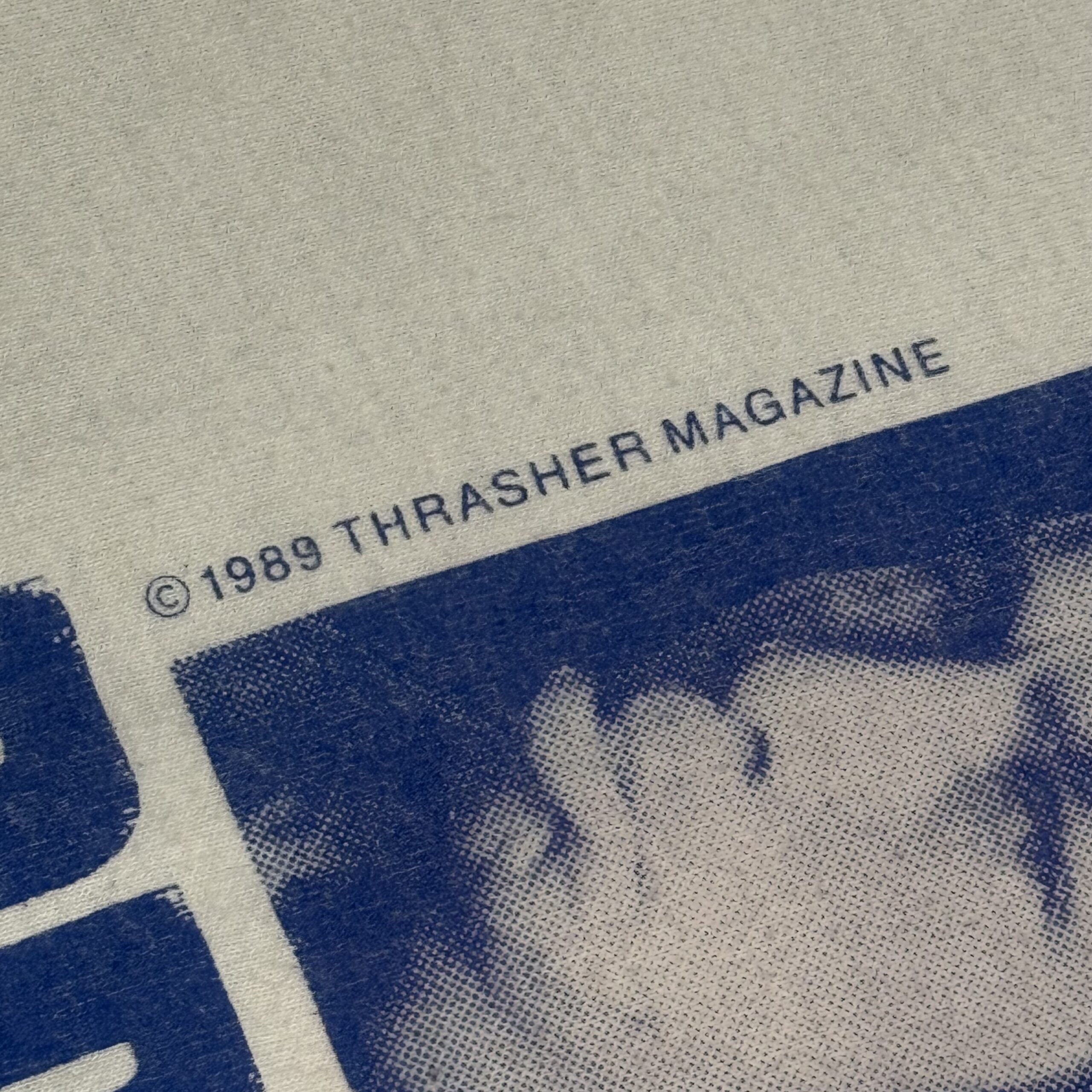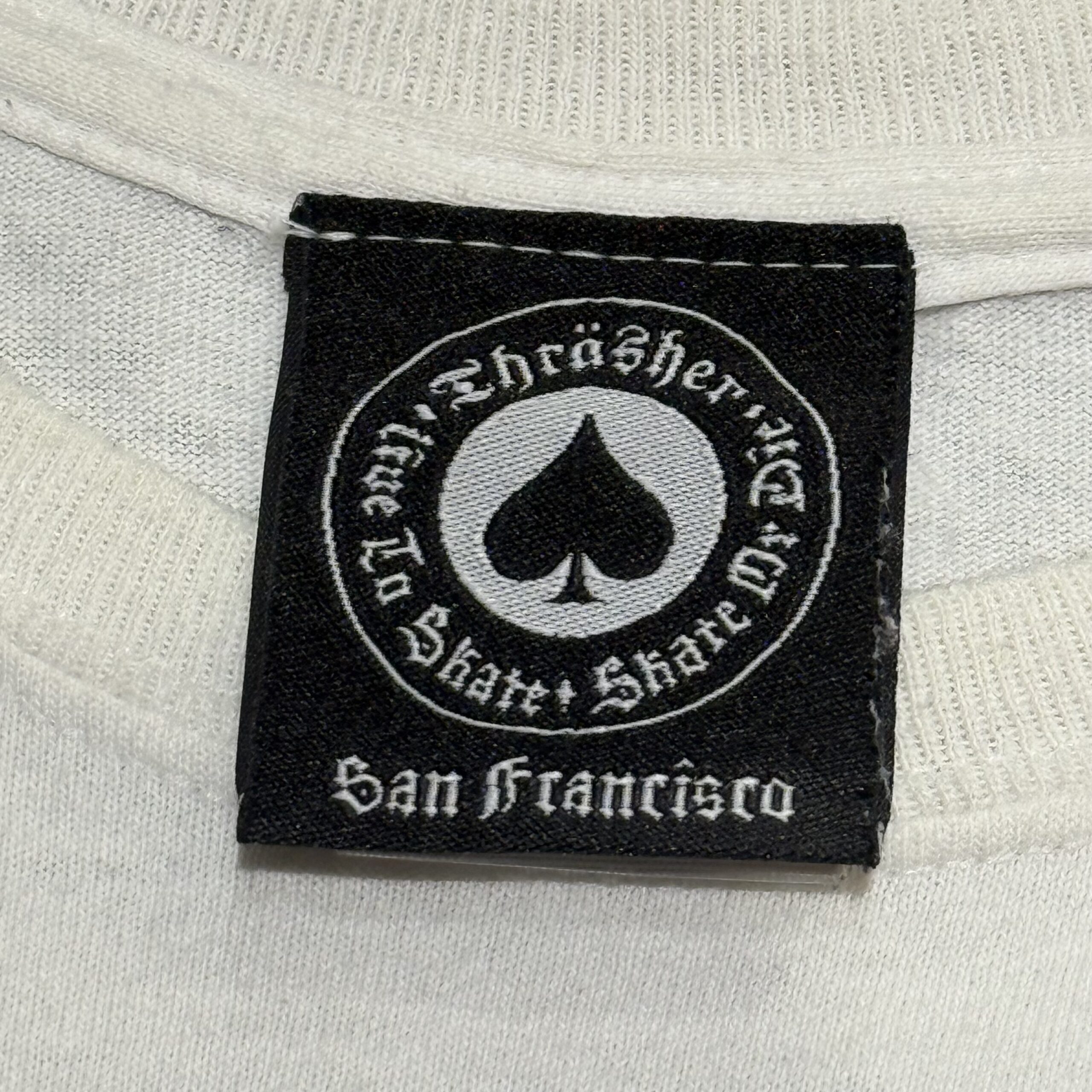 レジェンドスケーター「Mark Gonzales」がプリントされた一着。Thrasherっぽくないのが逆に良いかなと。弾数もかなり少なく、現在ではあまり見なくなりました。特にオールドスケート好きの方には堪らない一着ではないでしょうか。ホワイトボディにブルーのプリント。配色も抜群にかっこいいです。Mサイズ表記ですが、Lサイズ相当の大きさはあるかなと。