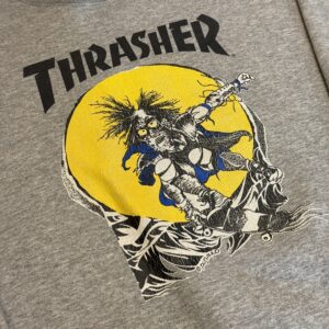 スカルをモチーフにしたハードコアなイラストが特徴的なアーティスト「パスヘッド」。彼が手掛けるThrasherの中でも有名なイラストがフロントにプリントされております。袖はカットされており、ロンTの上から重ね着で合わせて頂くのがかっこいいかなと。